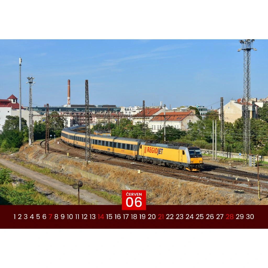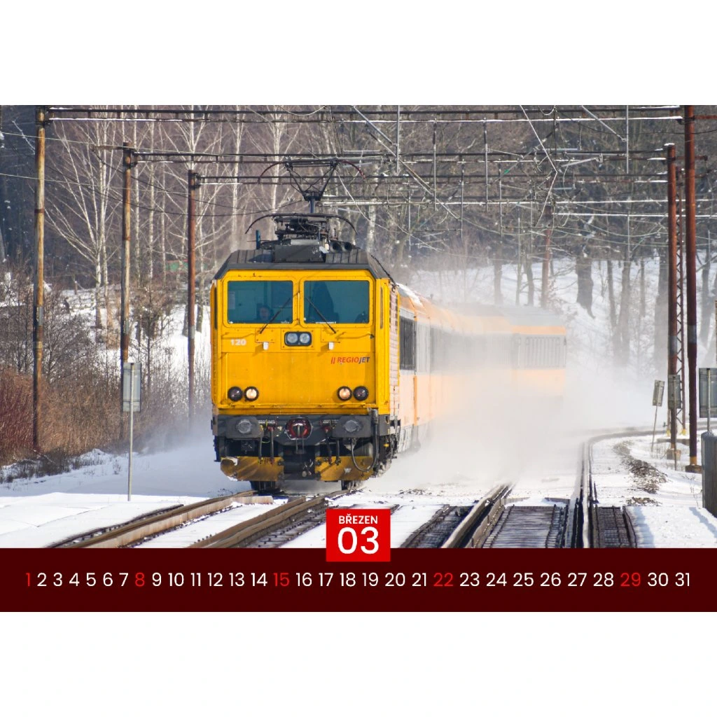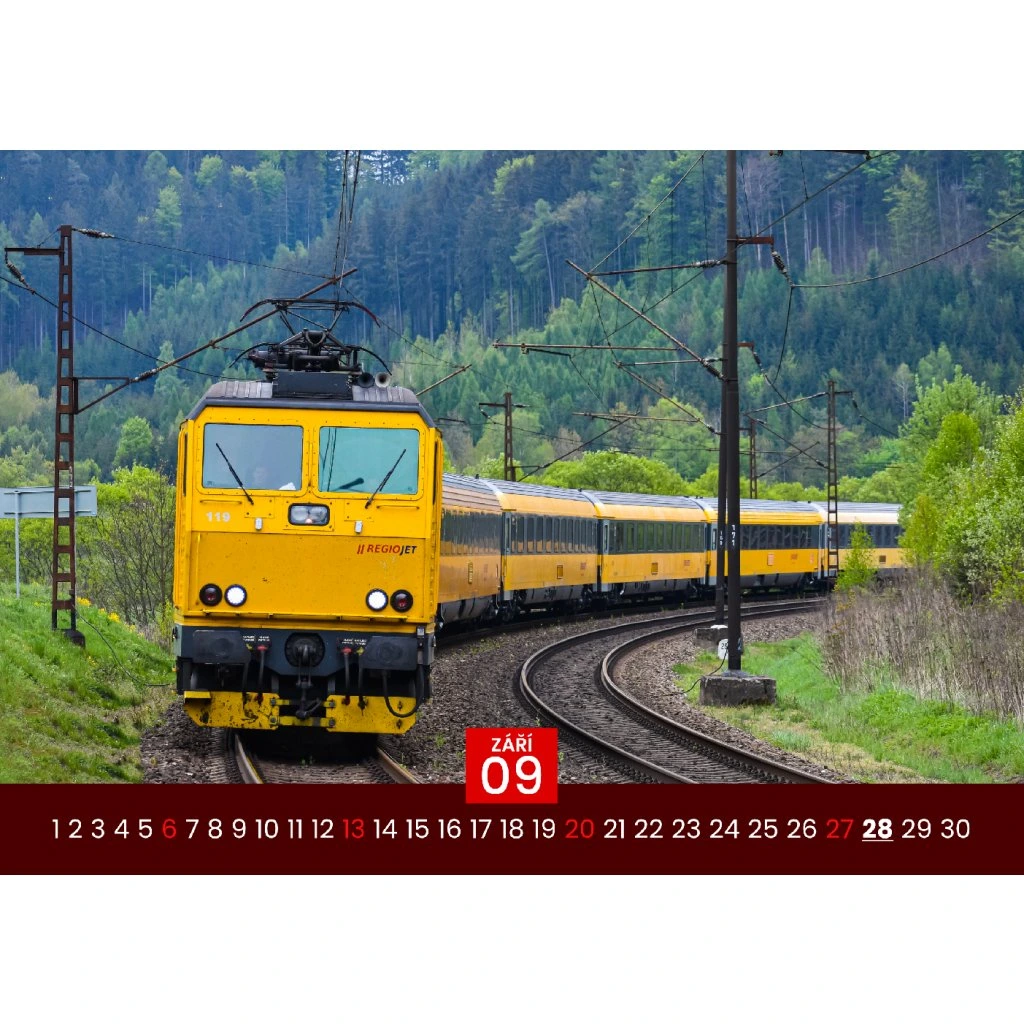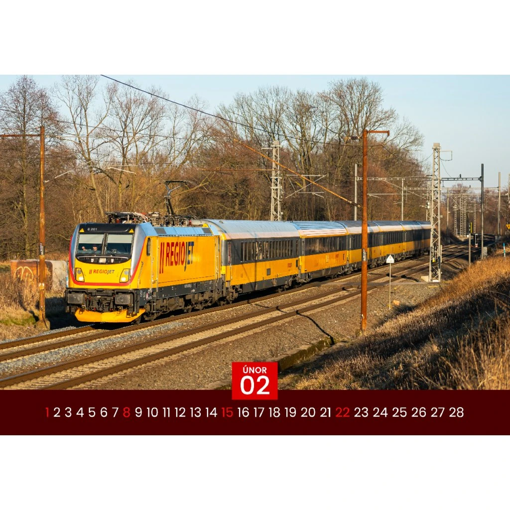 Tento výnimočný kalendár vo formáte A3 je venovaný fanúšikom moderných vlakov, a najmä ikonickej železničnej spoločnosti RegioJet, známej svojimi žltými súpravami, ktoré sa stali neprehliadnuteľným symbolom na českých a slovenských tratiach. Kalendár prináša 12 kvalitných farebných fotografií zachytávajúcich rušne, vozne a celé súpravy žltých vlakov v rozličných prostrediach a ročných obdobiach.