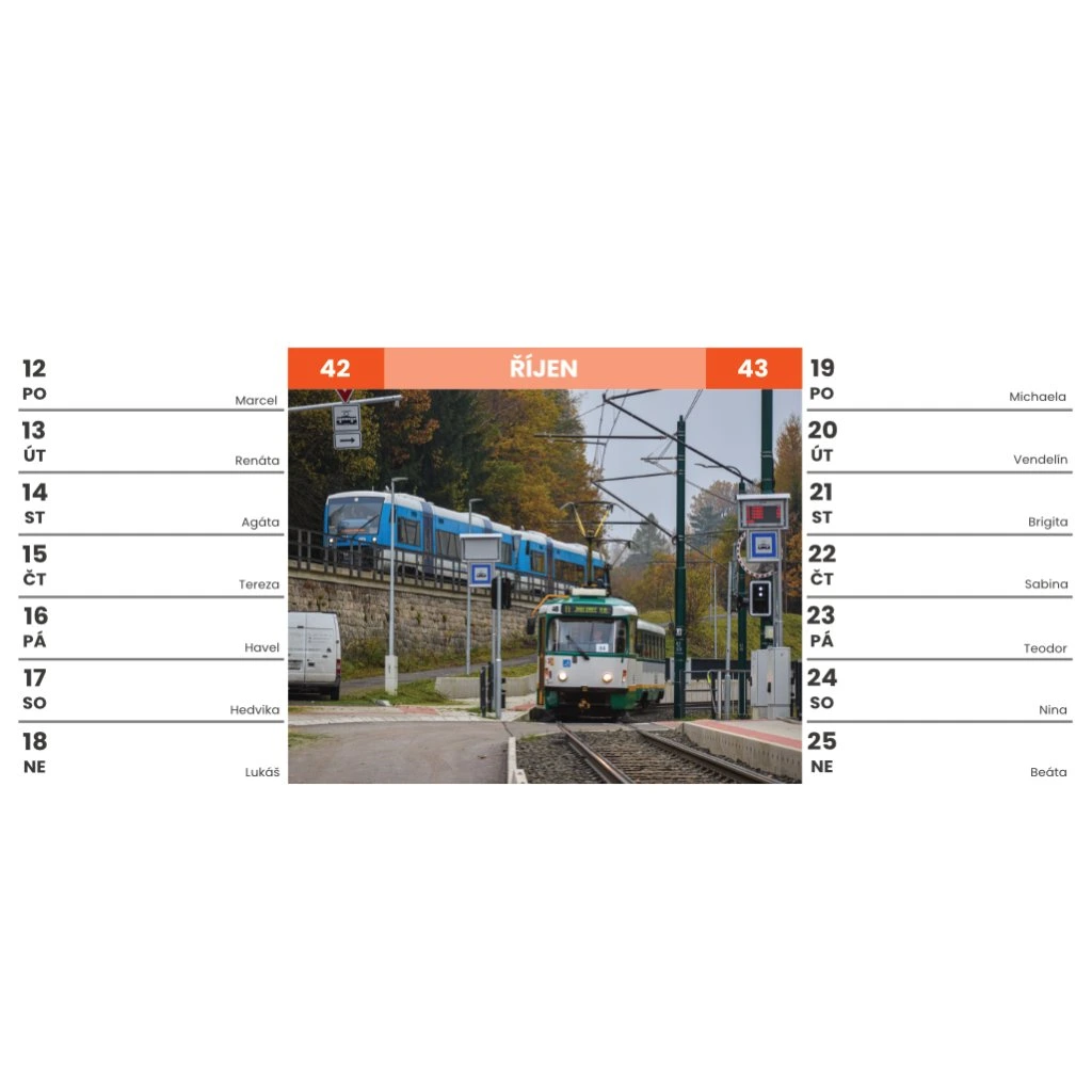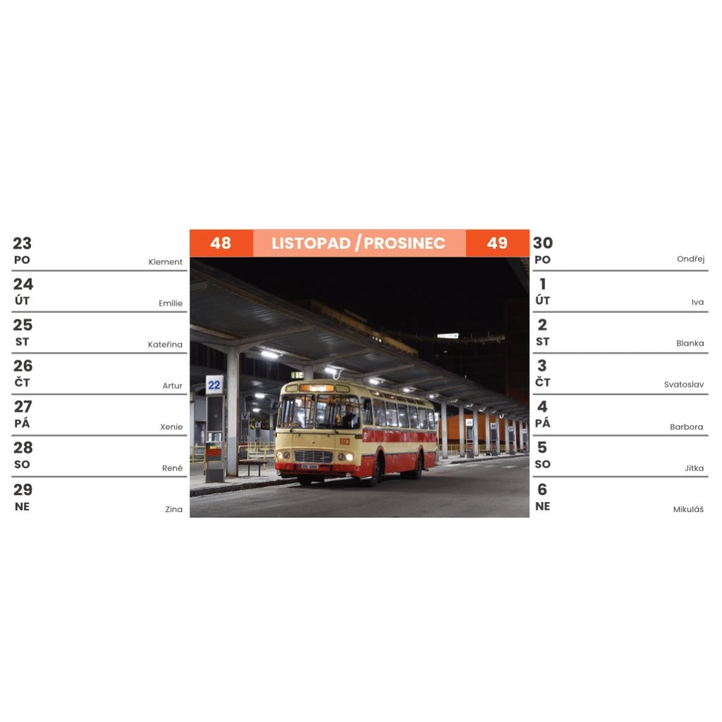 Pre milovníkov autobusovej dopravy a električiek – tento kalendár s kovovou krúžkovou väzbou prináša 25 - 14 denných nádherných fotografií legendárnych vozidiel. Každú stranu obohacuje kvalitná fotografia dopravného prostriedku na českom alebo slovenskom pozadí, zachytávajúca historický i technický šarm vozidiel.