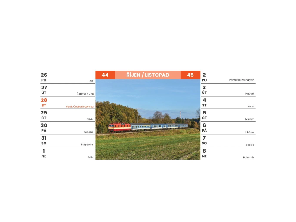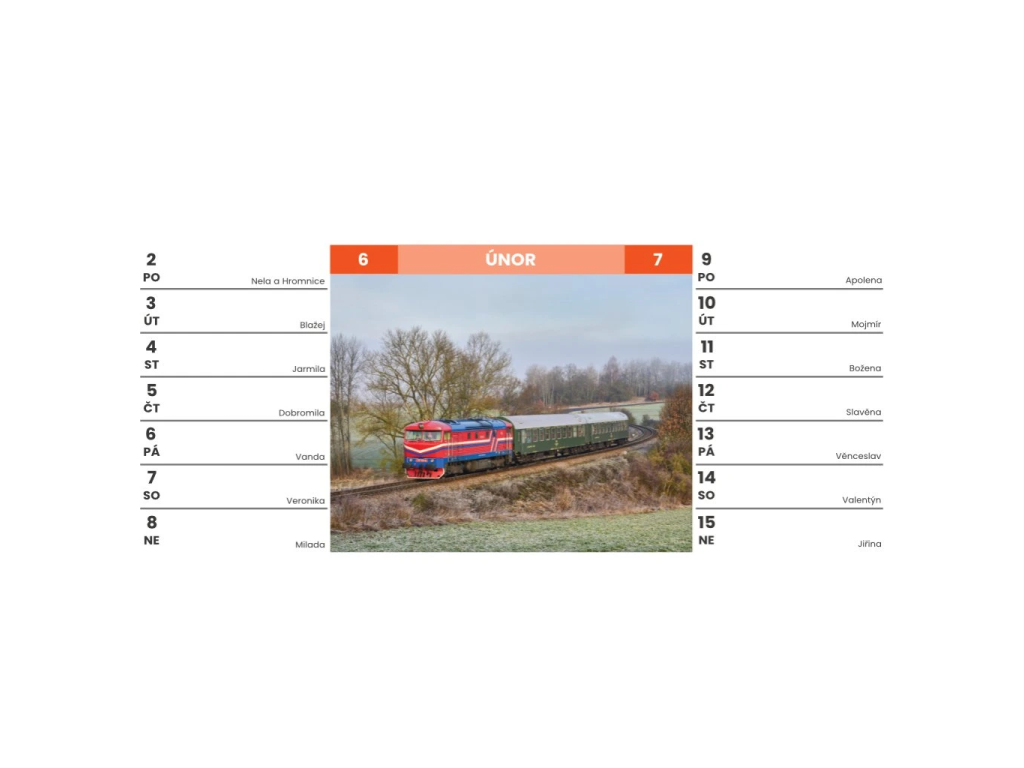 Pre milovníkov železničnej dopravy prináša tento kalendár s kovovou krúžkovou väzbou 25 - 14 denných nádherných fotografií legendárnych vozidiel. Každú stranu obohacuje kvalitná fotografia dopravného prostriedku na českom alebo slovenskom pozadí, zachytávajúca historický i technický šarm vozidiel.