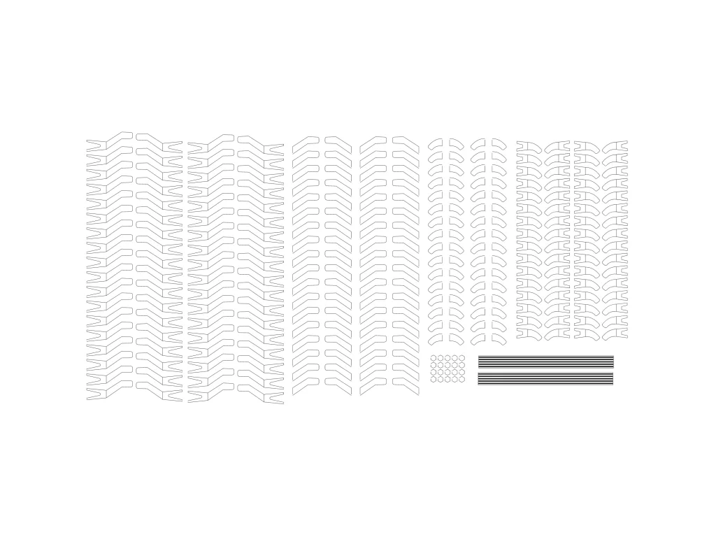 Doplnok obsahuje: 72x horný dezén (0,35mm) + 72x spodný dezen na veľké kolesá (1mm) a 64x horný dezén (0,35mm) + 64x spodný dezen na malé kolesá (1mm) + 2x dezén na vlek (0,35mm) a 20ks matíc (0,35mm) + 20ks matíc (1mm).