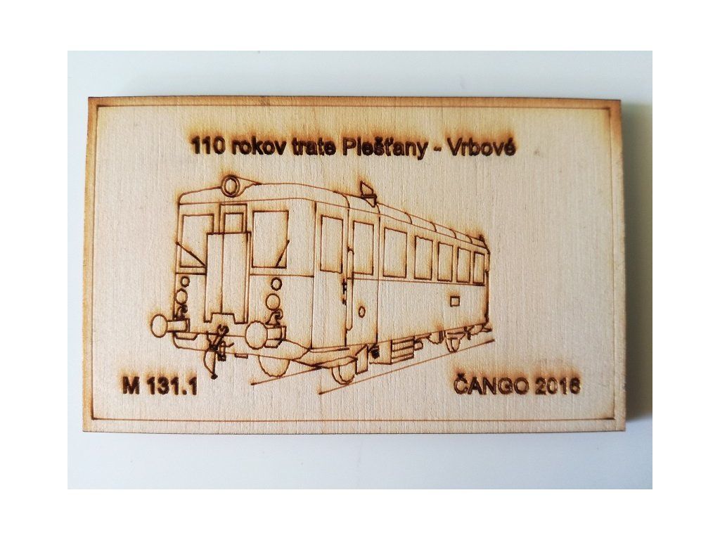 Magnetka vypálená laserom do bukovej preglejky 110r. trate Piešťany-Vrbove M131.1