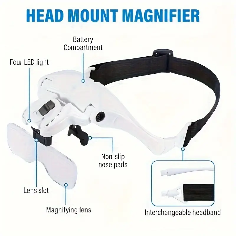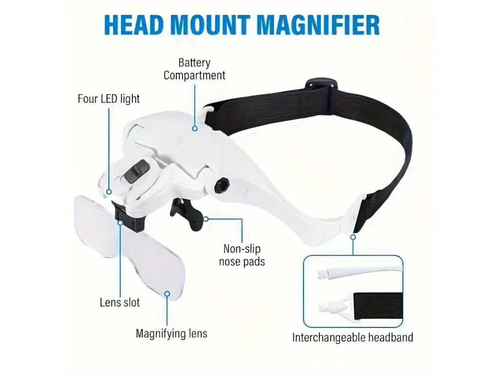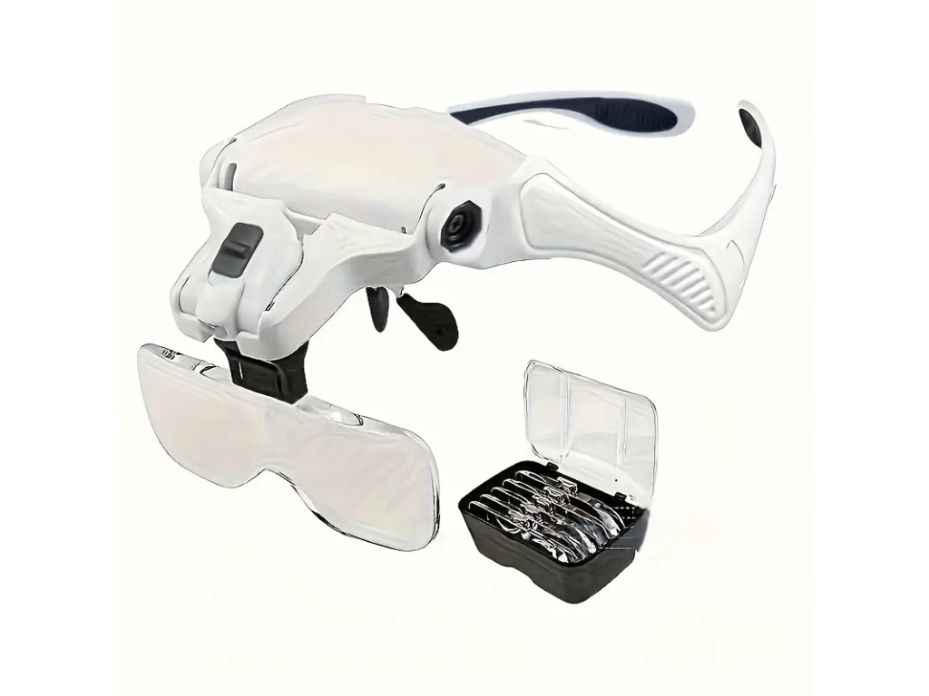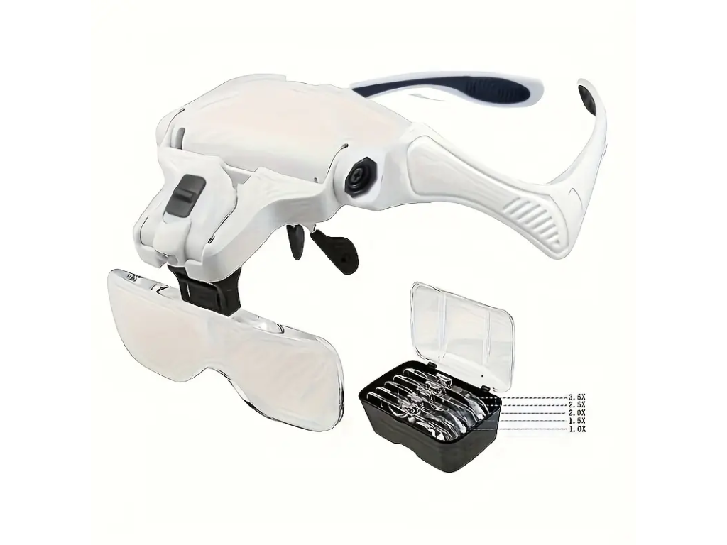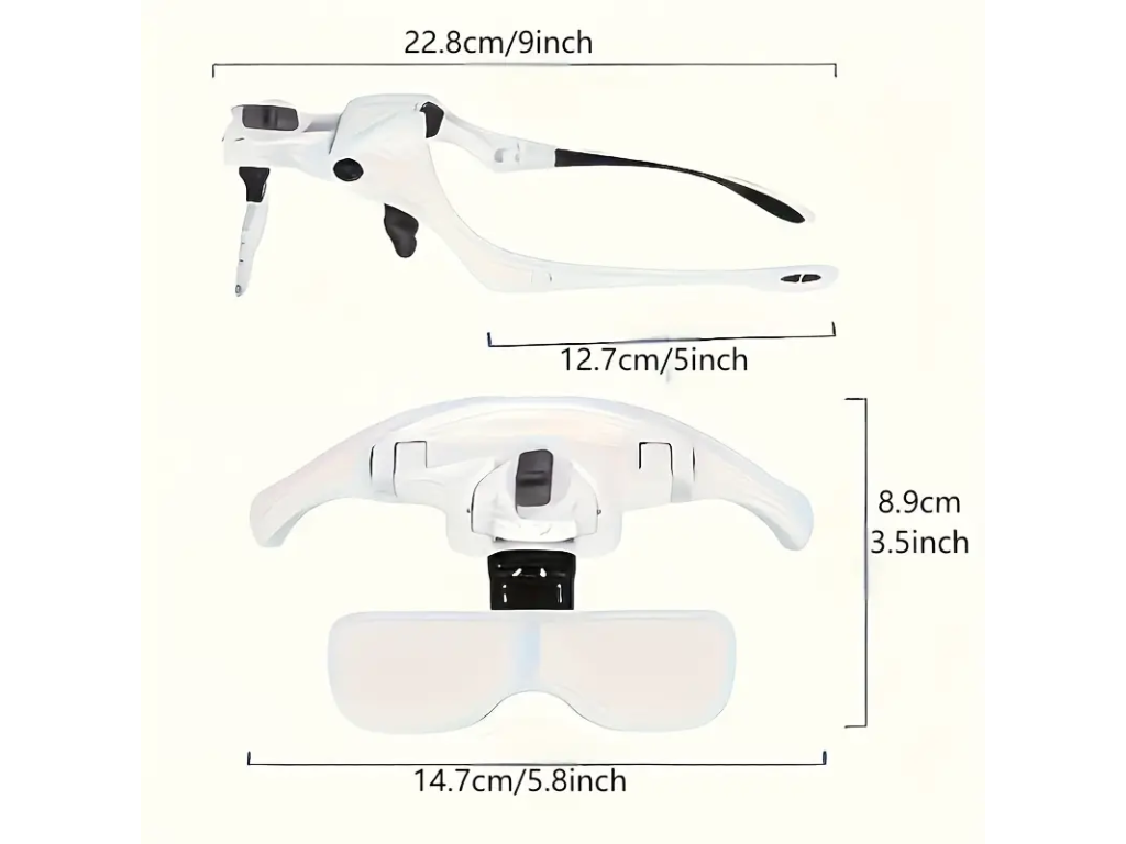 Okuliare majú sklopné šošovky s možnosťou nastavenia uhla podľa potreby. O presné osvetlenie detailov sa starajú 2 zabudované LED svetlá, ktoré pracujú na 3× AAA batérie (nie sú súčasťou balenia).