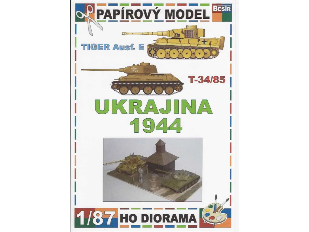Nepostavený papierový model, stavebnica, vystrihovačka Dioráma Ukrajina 1944 - Tiger Ausf. E / T-34/85.
