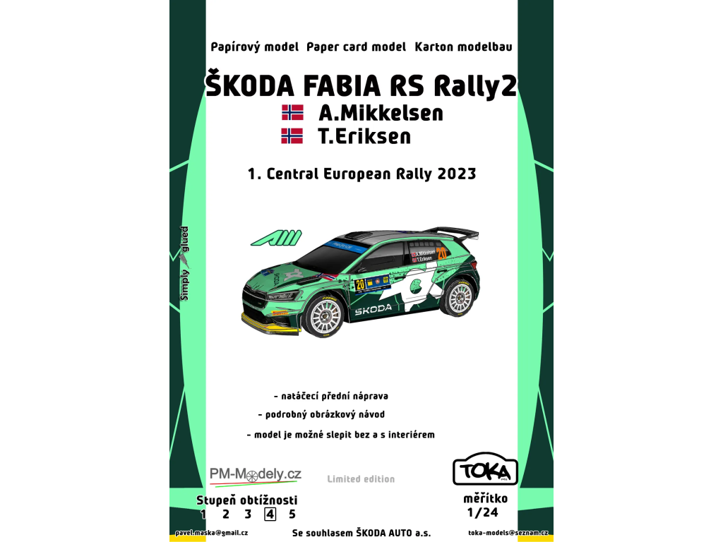 Papierový model v mierke 1/24. Model je zo závodu Central European Rally 2023. Model vznikol v licencii Škoda auto as Model je možné zlepiť s interiérom a bez neho. Model obsahuje zaujímavé interiérové doplnky a umožňuje modelárovi sa viac pohrať aj s vlastnými doplnkami a úpravami.