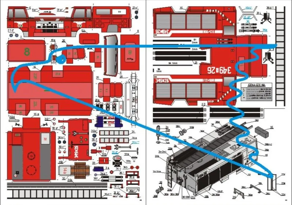 Papierový model má návod v Polštine a obsahuje množstvo farebných, číslovaných dielov a je tlačený ofsetom na stranách A4. Ofset je tlačová technika, pri ktorej sa farba na papier nanáša z tlačového valca, pomocou gumového valca, pretože guma sa lepšie priľne na nerovnosti papiera a dokáže teda vytlačiť aj najjemnejšie detaily. Narozdiel od atramentovej či laserovej tlače sa nerozpíja a neodlupuje pri následnej práci. Model je vytlačený na papieri s gramážou 170g/m2, teda dvojnásobnej hrúbke kancelárskeho papiera (tzv. modelárska štvrťka). Tento papier je štandardne používaný výrobcami modelov, pretože je na prácu najvhodnejší.