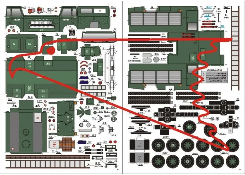 Papierový model má návod v Polštine a obsahuje množstvo farebných, číslovaných dielov a je tlačený ofsetom na stranách A4. Ofset je tlačová technika, pri ktorej sa farba na papier nanáša z tlačového valca, pomocou gumového valca, pretože guma sa lepšie priľne na nerovnosti papiera a dokáže teda vytlačiť aj najjemnejšie detaily. Narozdiel od atramentovej či laserovej tlače sa nerozpíja a neodlupuje pri následnej práci. Model je vytlačený na papieri s gramážou 170g/m2, teda dvojnásobnej hrúbke kancelárskeho papiera (tzv. modelárska štvrťka). Tento papier je štandardne používaný výrobcami modelov, pretože je na prácu najvhodnejší.