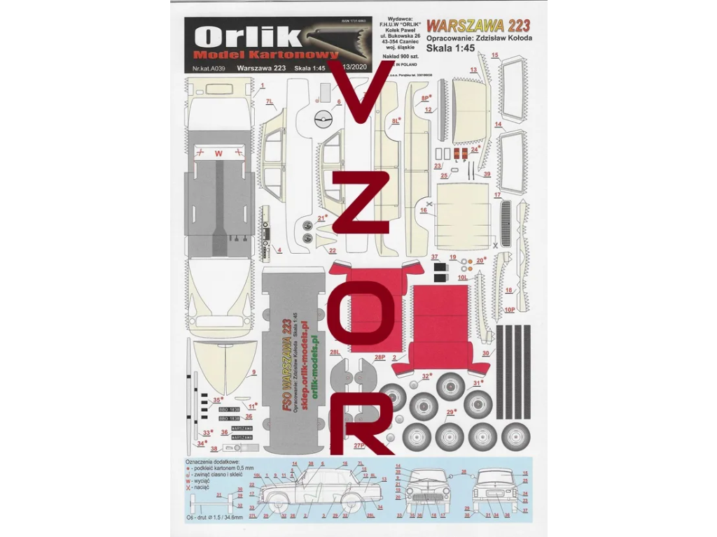 Papierový model má návod v Polštine a obsahuje množstvo farebných, číslovaných dielov a je tlačený ofsetom na stranách A4Ofset je tlačová technika, pri ktorej sa farba na papier nanáša z tlačového valca, pomocou gumového valca, pretože guma sa lepšie priľne na nerovnosti papiera a dokáže teda vytlačiť aj najjemnejšie detaily. Narozdiel od atramentovej či laserovej tlače sa nerozpíja a neodlupuje pri následnej práci. Model je vytlačený na papieri s gramážou 160g/m2, teda dvojnásobnej hrúbke kancelárskeho papiera (tzv. modelárska štvrťka). Tento papier je štandardne používaný výrobcami modelov, pretože je na prácu najvhodnejší.
