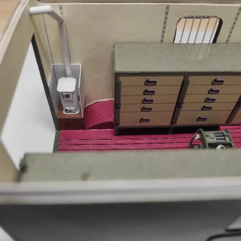 Modelárov, ktorí sú skúsenejší, poteší varianta s úplným interiérom skladu strojnej dielne (regále, motorová striekačka PS3, ručné čerpadlo na phm), predný vozík prívesu a oje sú pohyblivé. Interiér, môžete podľa vlastnej úvahy vnútorné časti vynechať.