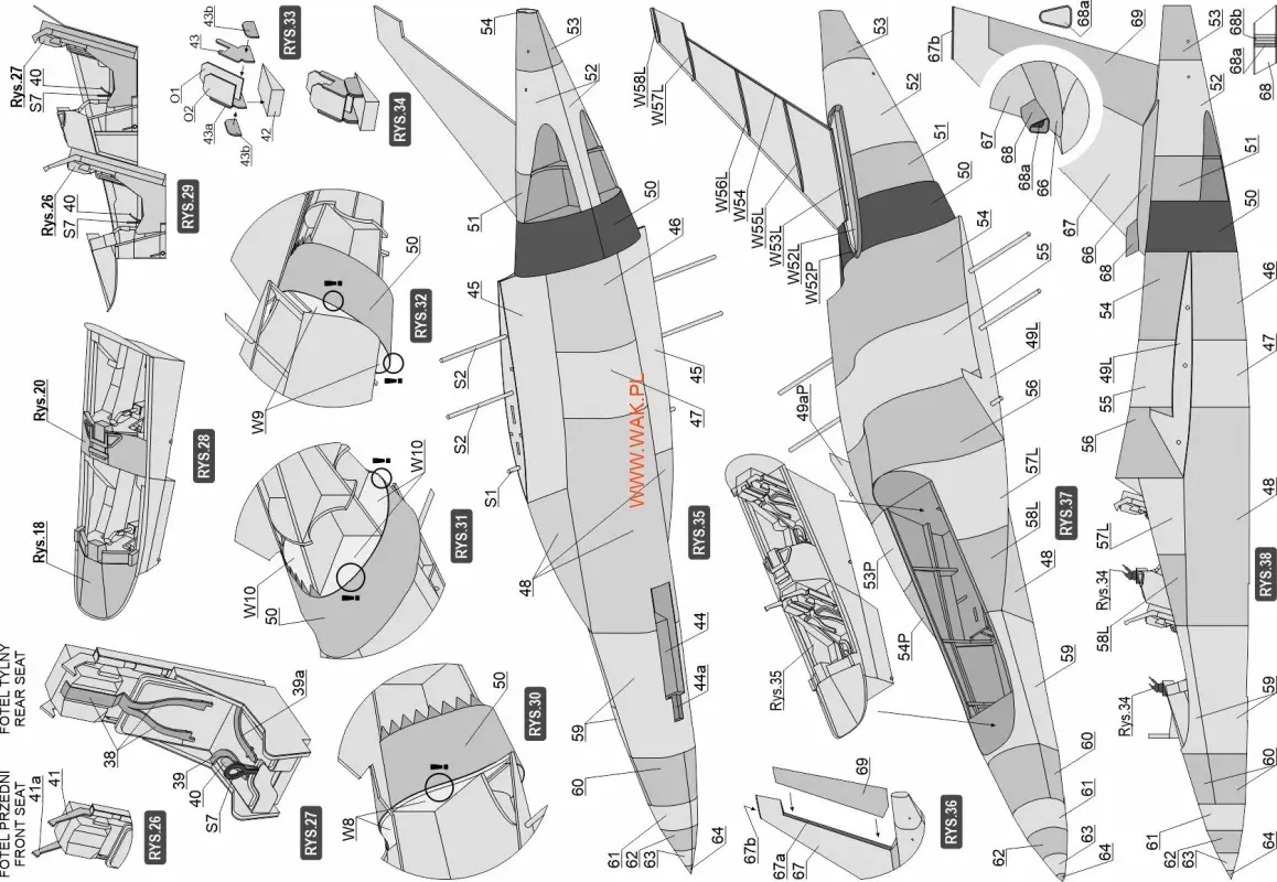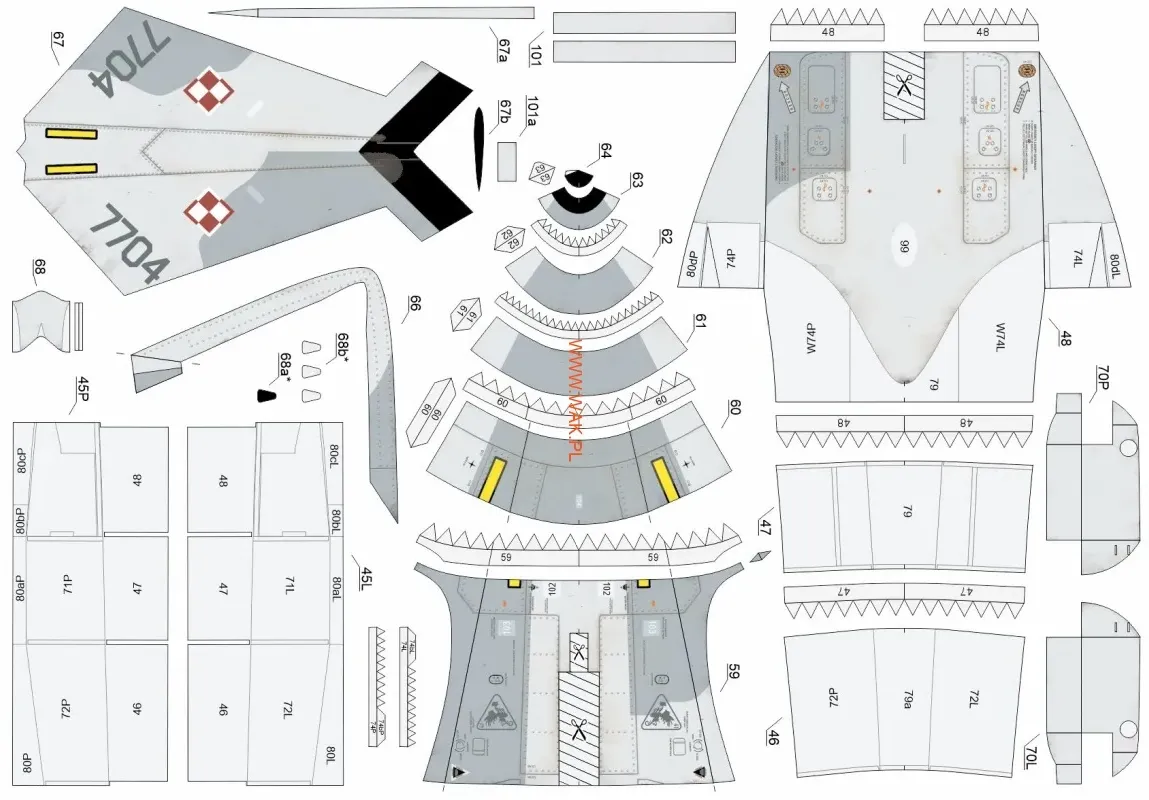 Papierový model má návod v polštine a angličtine a obsahuje množstvo farebných, číslovaných dielov a je tlačený ofsetom na stranách A4. Ofset je tlačová technika, pri ktorej sa farba na papier nanáša pomocou gumového valca, pretože lepšie priľne a dokáže vytlačiť aj najjemnejšie detaily. Tlač sa pri následnej práci nerozpíja a neodlupuje. Stavebnica je vytlačená na papieri s gramážou približne dvojnásobnej hrúbky kancelárskeho papiera (tzv. modelárska štvrťka). Tento papier je štandardne na prácu najvhodnejší.