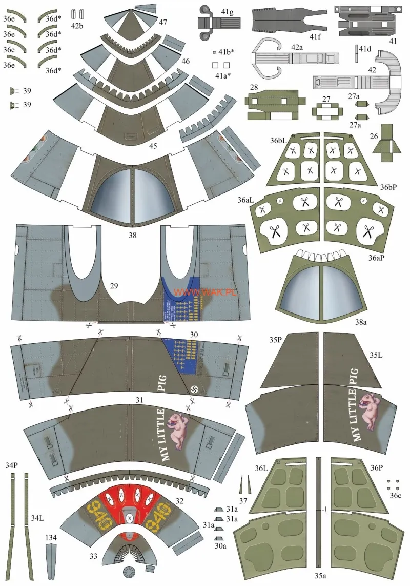Papierový model má návod v polštine a angličtine a obsahuje množstvo farebných, číslovaných dielov a je tlačený ofsetom na 12 stranách A4. Ofset je tlačová technika, pri ktorej sa farba na papier nanáša pomocou gumového valca, pretože lepšie priľne a dokáže vytlačiť aj najjemnejšie detaily. Tlač sa pri následnej práci nerozpíja a neodlupuje. Stavebnica je vytlačená na papieri s gramážou približne dvojnásobnej hrúbky kancelárskeho papiera (tzv. modelárska štvrťka). Tento papier je štandardne na prácu najvhodnejší.