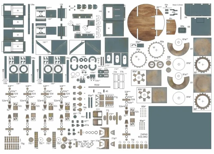 Niektoré diely vydavateľ doporučuje podlepiť modelárskym kartónom A3 0,2 / 0,5 / 1mm alebo 2mm hrúbky, ktorý sa nachádza tak isto v našej ponuke.
