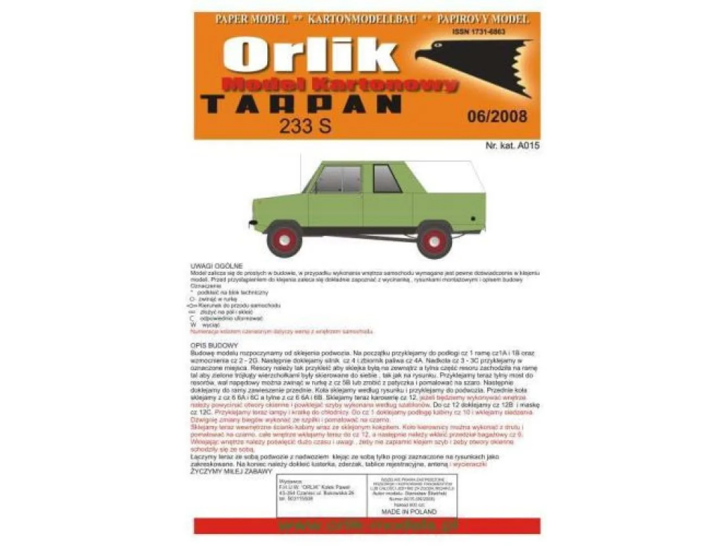 Papierový model má návod v Polštine a obsahuje množstvo farebných, číslovaných dielov a je tlačený ofsetom na stranách 167x245mm. Ofset je tlačová technika, pri ktorej sa farba na papier nanáša z tlačového valca, pomocou gumového valca, pretože guma sa lepšie priľne na nerovnosti papiera a dokáže teda vytlačiť aj najjemnejšie detaily. Narozdiel od atramentovej či laserovej tlače sa nerozpíja a neodlupuje pri následnej práci. Model je vytlačený na papieri s gramážou 160g/m2, teda dvojnásobnej hrúbke kancelárskeho papiera (tzv. modelárska štvrťka). Tento papier je štandardne používaný výrobcami modelov, pretože je na prácu najvhodnejší.