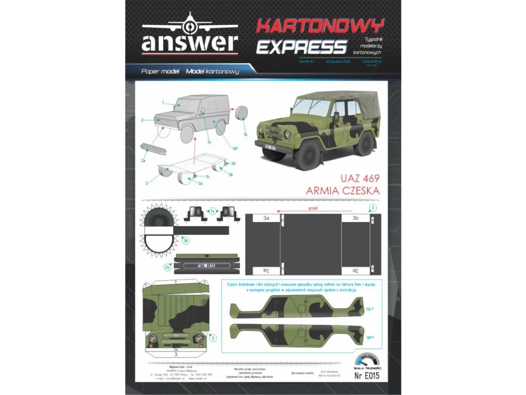 Papierový model má návod v Polštine a obsahuje niekoľko farebných, číslovaných dielov a je tlačený ofsetom na 1,5 stranách A4. Ofset je tlačová technika, pri ktorej sa farba na papier nanáša z tlačového valca, pomocou gumového valca, pretože guma sa lepšie priľne na nerovnosti papiera a dokáže teda vytlačiť aj najjemnejšie detaily. Narozdiel od atramentovej či laserovej tlače sa nerozpíja a neodlupuje pri následnej práci. Model je vytlačený na papieri s gramážou 160g/m2, teda dvojnásobnej hrúbke kancelárskeho papiera (tzv. modelárska štvrťka). Tento papier je štandardne používaný výrobcami modelov, pretože je na prácu najvhodnejší.