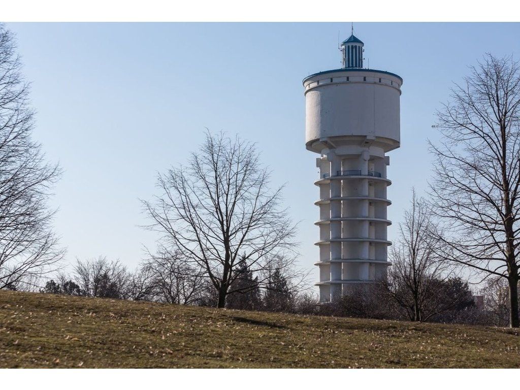 Projekt vodojemu pochádza z roku 1941. Výstavba prebehla v rokoch 1942 až 1946. Do prevádzky ho odovzdali v roku 1954. Stavba je architektonicky hodnotná vďaka jedinečnému tvaru šiestich železobetónových nosných pilierov, obopnutých skružami, a valcovej nádrži. Výrazné sú tak aj tie časti, ktoré majú inokedy hlavne konštrukčnú funkciu. Plná hmota nádrže a odľahčená zostava nosnej časti sú v peknom kontraste. Valec uprostred stĺpov ukrýva technické schodisko a vodovodné potrubia. V plášti valca sú menšie obdĺžnikové okná. Podobný motív sa opakuje aj v hornej časti nádrže, kde okná osvetľujú okružnú chodbu. Na streche nádrže sa nachádza osvetľovacia a vetracia lucerna, ktorá je kompozičným dopovedaním stavby. Táto horná časť vodojemu je sprístupnená vďaka technickým rebríkom.